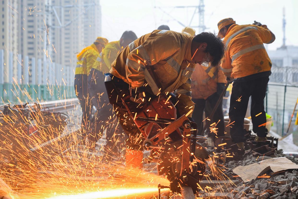 3月16日,铁路职工在京沪铁路南京林场站进行钢轨切割作业。新华社发(苏阳摄)