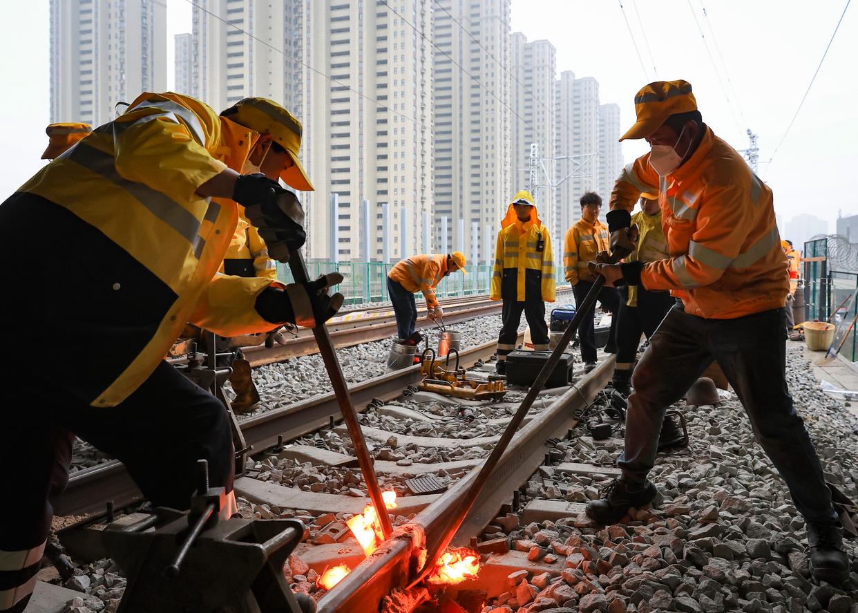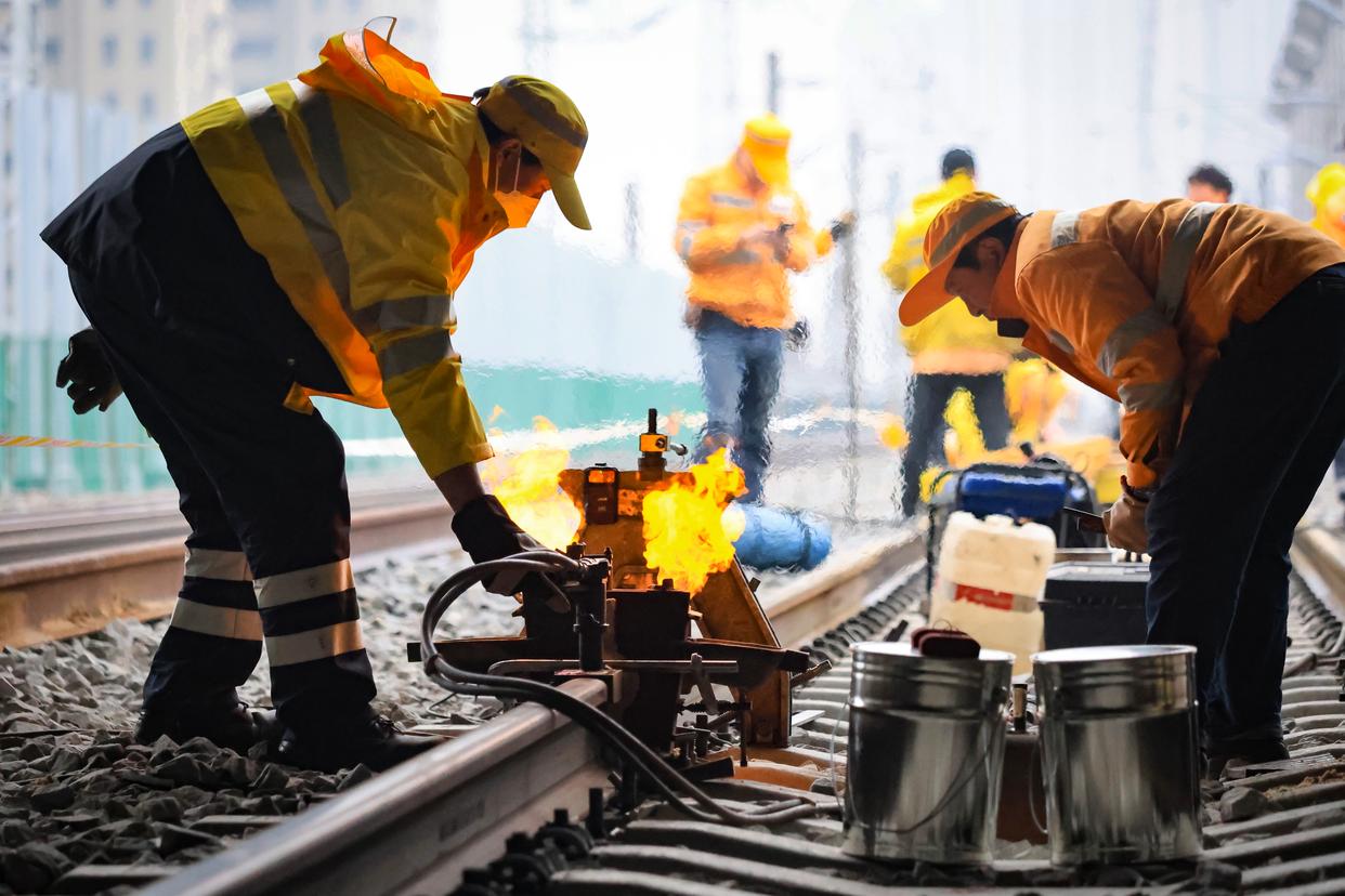 3月16日,铁路职工在京沪铁路南京林场站进行钢轨焊接作业。新华社发(苏阳摄)
