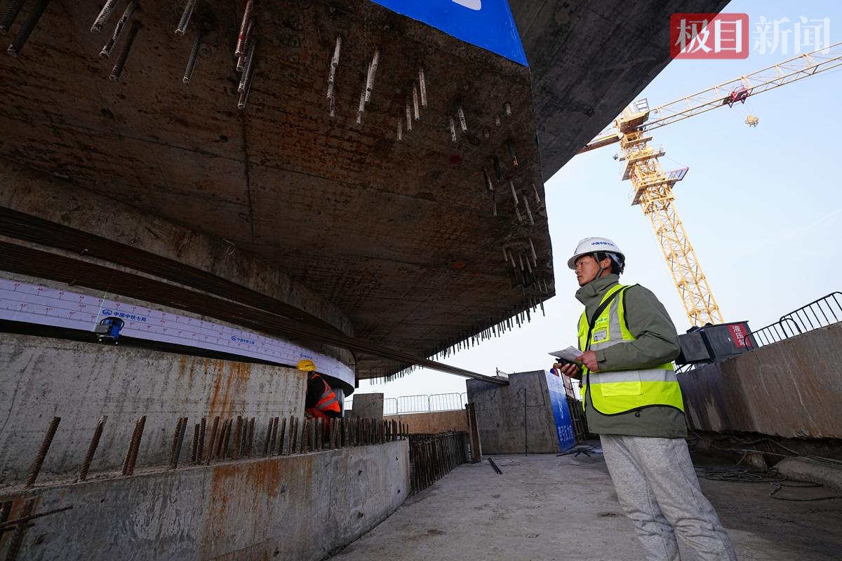 转体系统由直径4.5米的转体球铰、上下转盘、撑脚、滑道及智能牵引系统共同组成,主墩下承台尺寸达26米×21.5米,整套系统环环相扣,共同托举万吨巨构完成空中转身。“转体最怕的不是‘转不动’,而是‘停不住’,”现场技术负责人解释道,“就好比端着满满一碗水转身,不能洒出一滴。巨大梁体的惯性一旦刹不住,哪怕多走一厘米,后果都不堪设想。我们靠上百个传感器实时盯着每一个微小变化,全程动态纠偏,最终让这个大家伙稳稳当当落在了设计点位上。”凭借高精度球铰系统与智能牵引转体工艺的协同配合,项目团队圆满实现了施工零事故、铁路运营零影响、转体精度零偏差的“三零”目标。