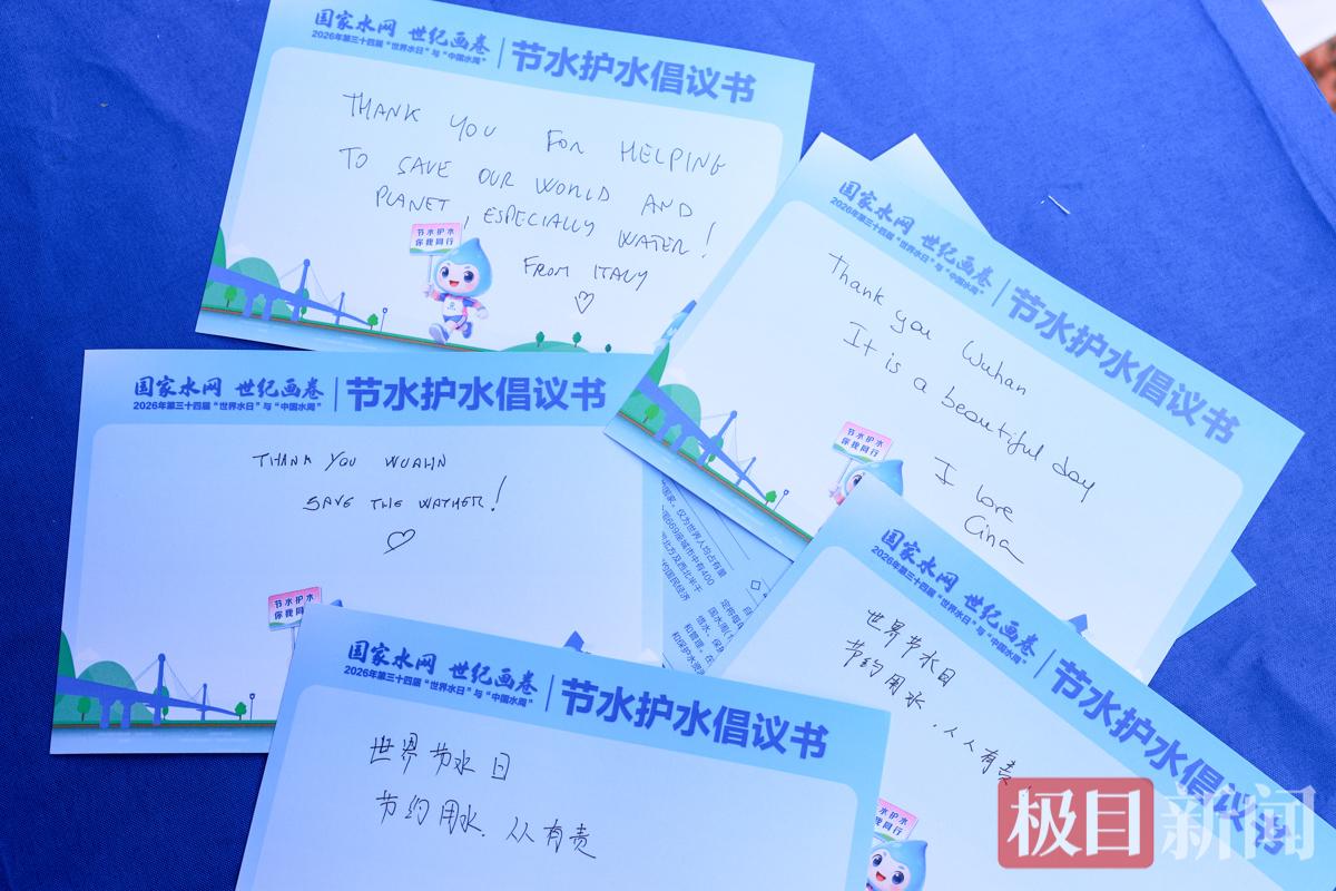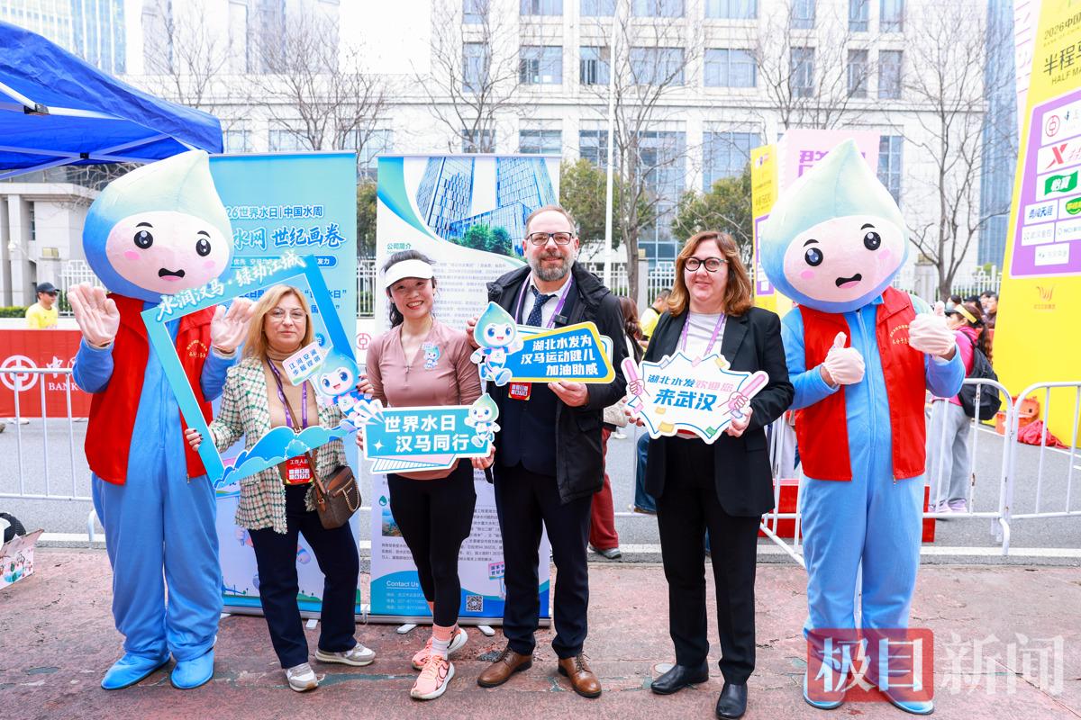 活动现场还设置了打卡区,现场观众和选手纷纷合影留念,定格汉马与世界水日的美好相遇。水分子志愿者们现场发放宣传单页,并宣讲2026年世界水日的主题,动员大家在节水倡议书上签名。