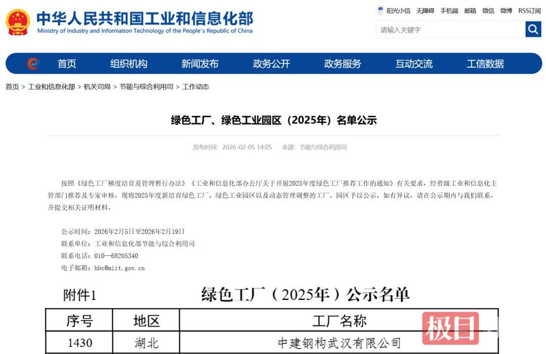 近日,工业和信息化部发布2025年度绿色工厂公示名单,中建钢构武汉有限公司(以下简称“武汉厂”)成功入选。至此,中建钢构已拥有三家国家级绿色制造基地,此前中建钢构四川有限公司、中建钢构广东有限公司已先后获评。