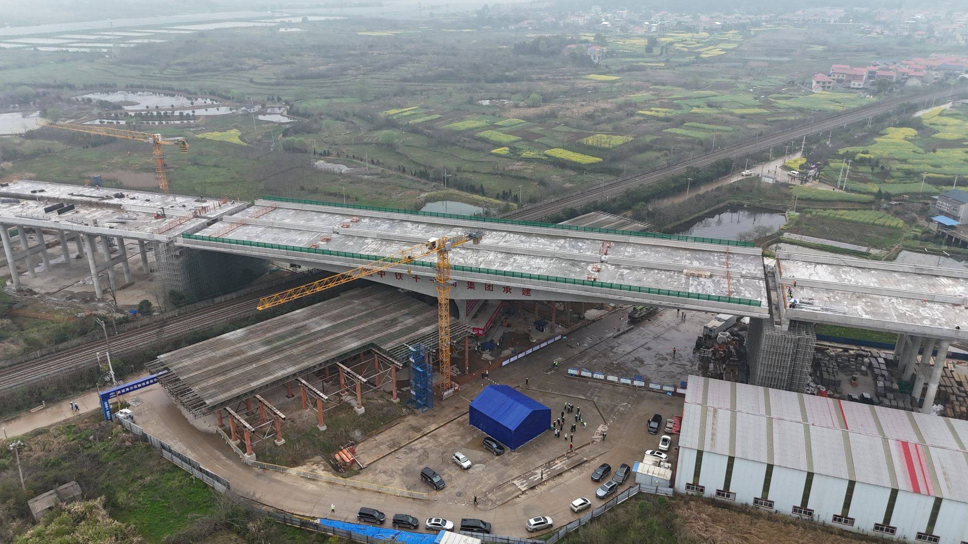 当天13时35分,随着现场总指挥的一声令下,在位于还地桥镇高垴村的鄂州机场高速二期涉铁工程施工现场,转体桥正式开始转体,施工人员紧盯监测数据,智能牵引系统平稳发力,整座桥梁如同在铁路线上方上演一场“空中芭蕾”,沿顺时针方向平稳转动。现场总指挥实时播报进度,全程安全有序,匀速平稳。14时15分,转体顺利完成,转体桥与两侧梁体实现精准对接,整个过程仅用时约40分钟,对接误差控制在毫米级以内。