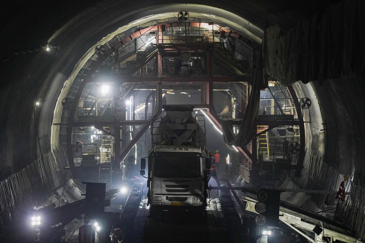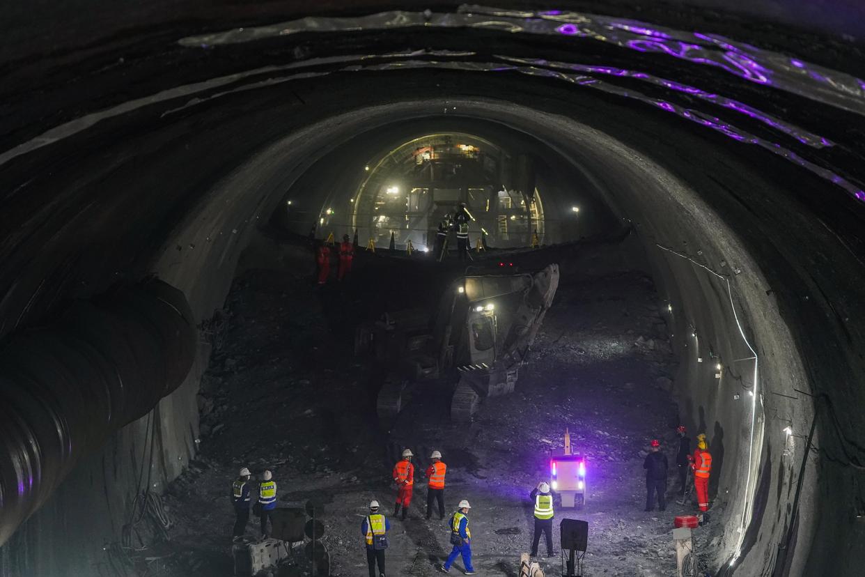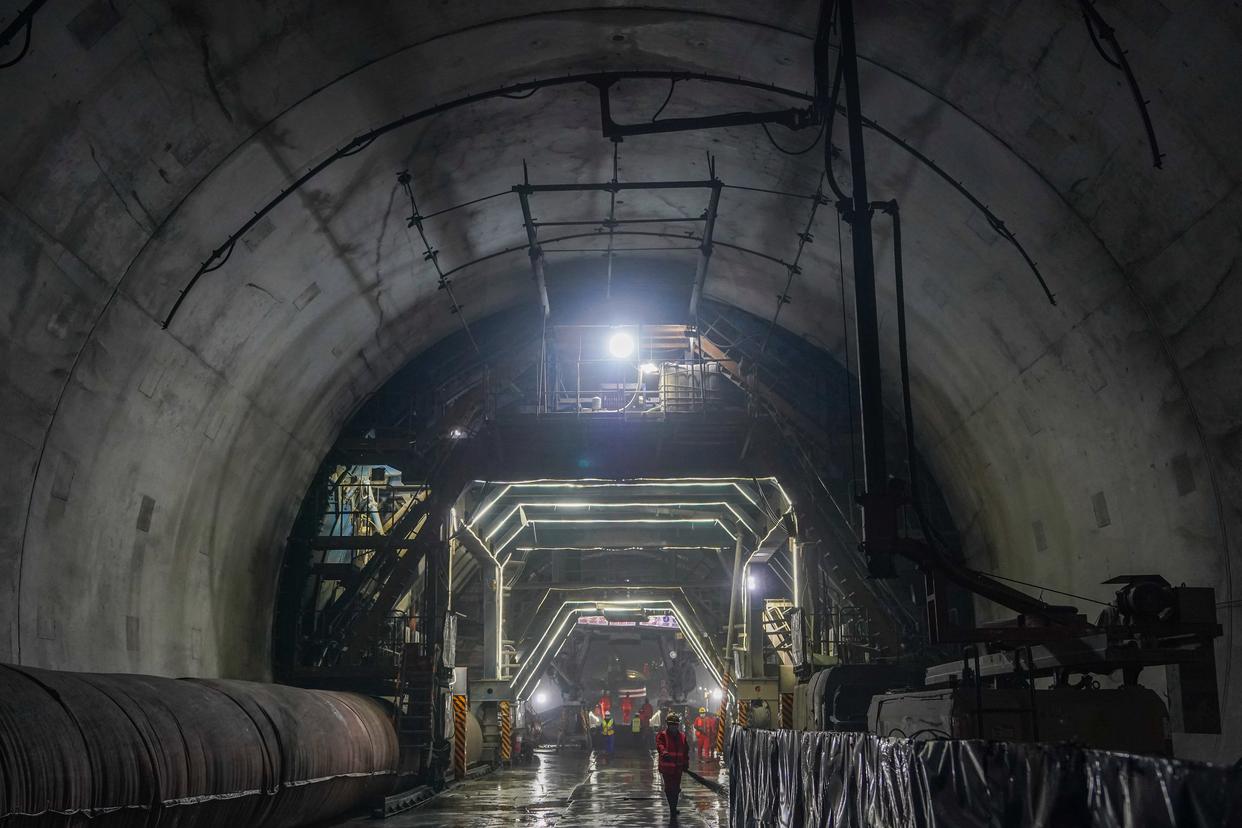 3月29日,工作人员在沪宁合高铁丰山隧道内施工。新华社记者 杜宇 摄
