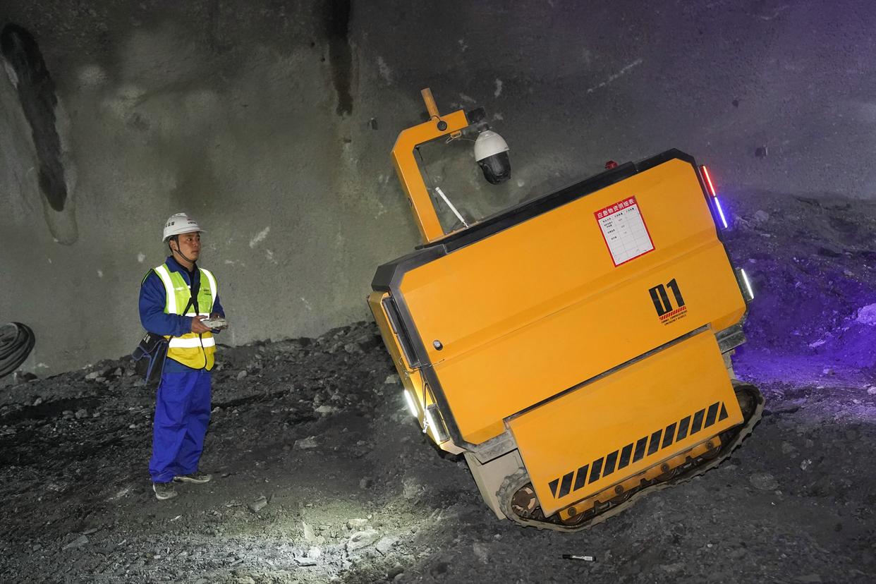 3月29日,工作人员操作智能化一体安全监控机器人在沪宁合高铁丰山隧道内作业。新华社记者 杜宇 摄