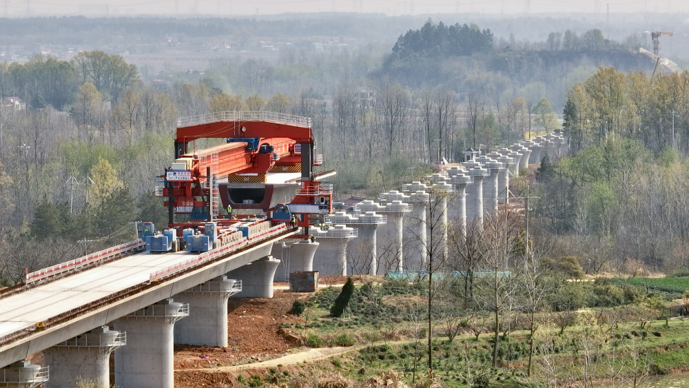 3月29日,中铁十一局工人在合武高铁安徽段灌集白塔畈河特大桥箱梁架设现场作业(无人机照片)。新华社记者 周牧 摄