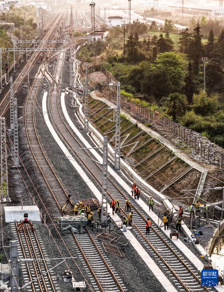 3月30日晚,工人在贵州瓮马铁路南北延伸线绿荫湖站改造工程现场施工。新华社记者 杨文斌 摄
