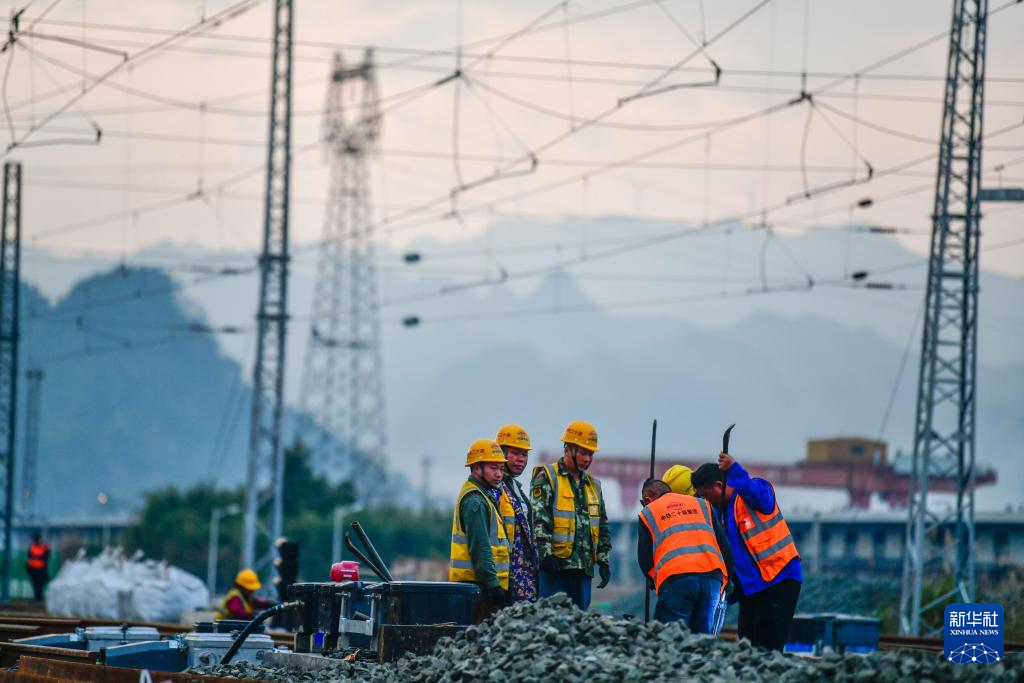 3月30日,工人在贵州瓮马铁路南北延伸线绿荫湖站改造工程现场施工。新华社记者 杨文斌 摄