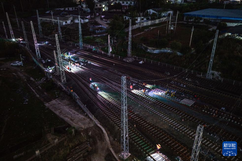 3月30日晚,工人在贵州瓮马铁路南北延伸线绿荫湖站改造工程现场施工(无人机照片)。新华社记者 杨文斌 摄