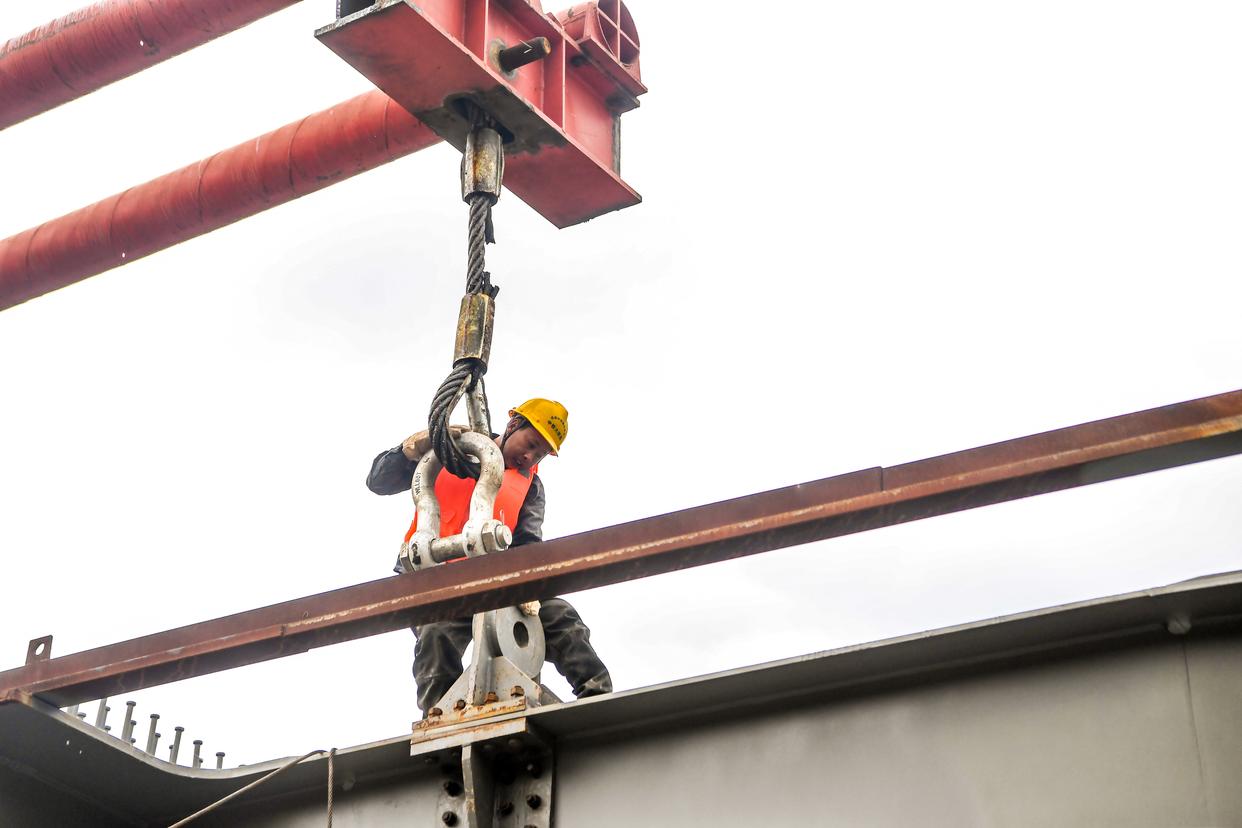 3月30日,工人在成渝中线高铁井口嘉陵江特大桥建设现场施工作业。新华社记者 唐奕 摄