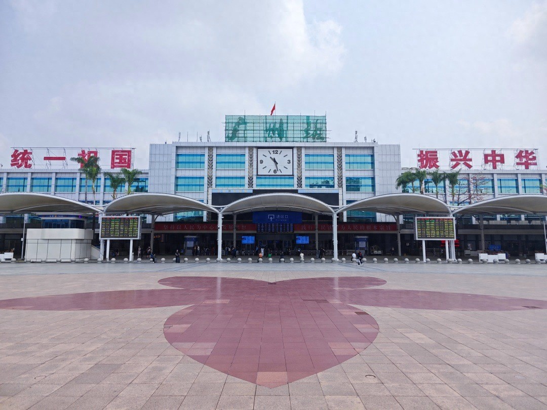 广州站自1974年建成投用以来,楼顶“广州站”三字历经多次调整:最初为郭沫若题写简体字样,上世纪80年代为便利港澳旅客改为繁体,1999年按规范恢复简体字体并沿用至今。1986年,依托广州站作为祖国南方重要门户、港澳台同胞与海外侨胞入境主要枢纽的定位,车站设置“统一祖国、振兴中华”标语,成为承载时代记忆与家国情怀的标志性符号。