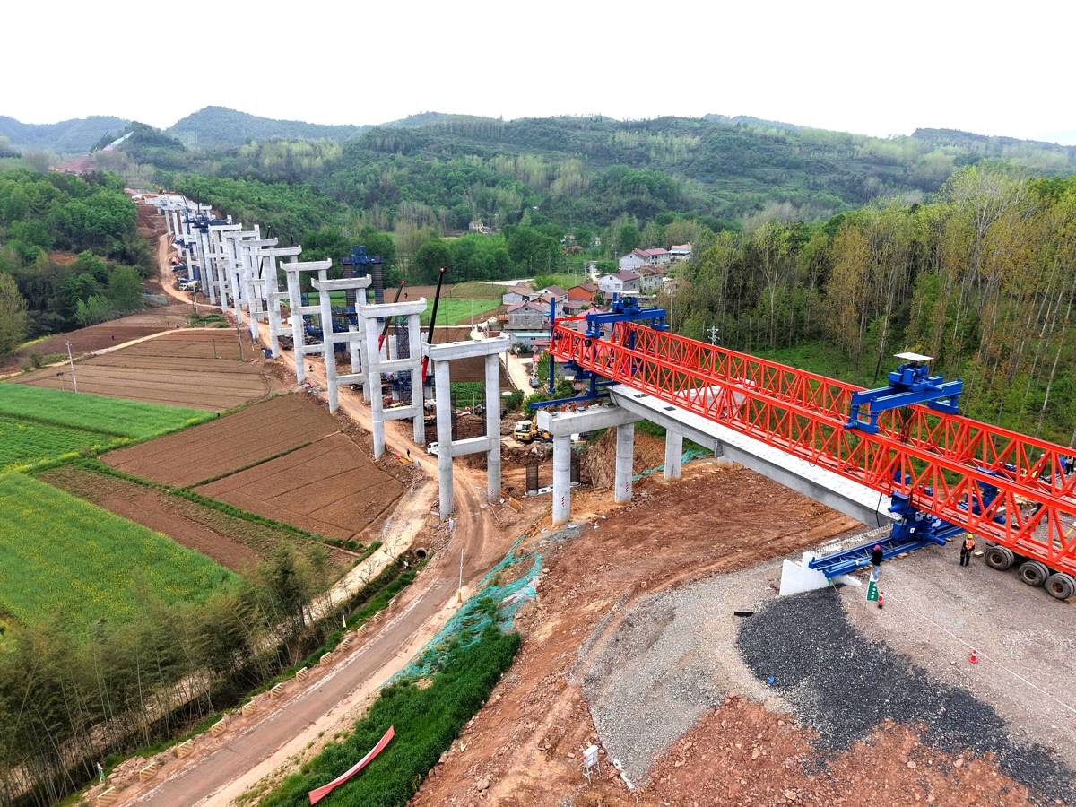 4月7日,平宜高速襄阳段八都河大桥施工现场,随着30米长的预制箱梁精准落位在桥墩支座上,平宜高速襄阳段首片箱梁成功架设。