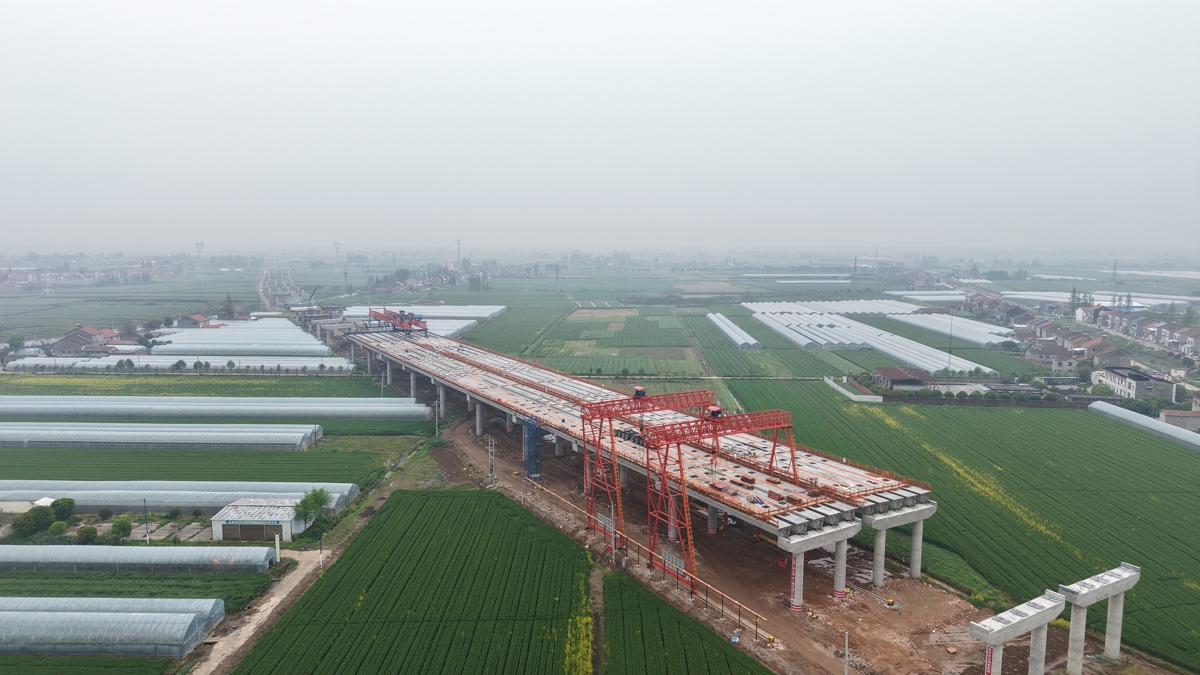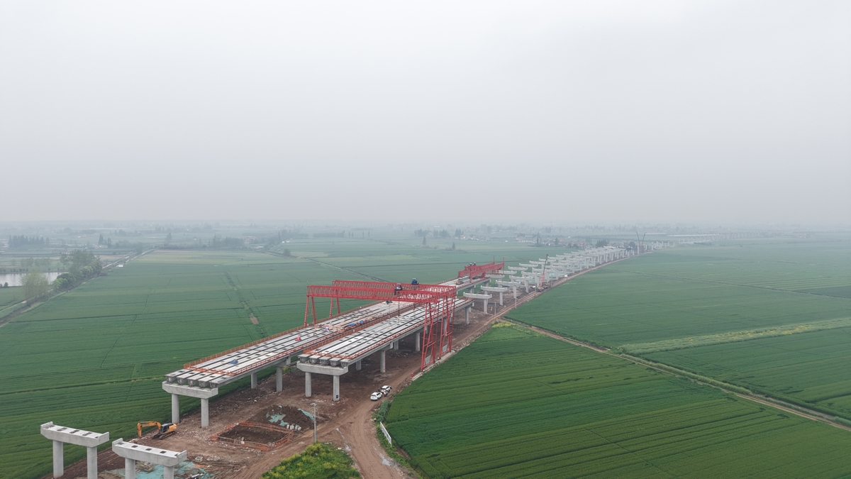 沿着4标施工区域驱车前往皮家高架桥提梁点,记者看到施工区域正处于大桥左幅第12联、右幅第13联的位置。项目工区长胡刚介绍,皮家高架桥全长2565.238米,共19联,需预制825片箱梁。“目前已完成135片箱梁预制和60片架设,下一步将重点推进盖梁施工,保障箱梁架设顺利进行。”