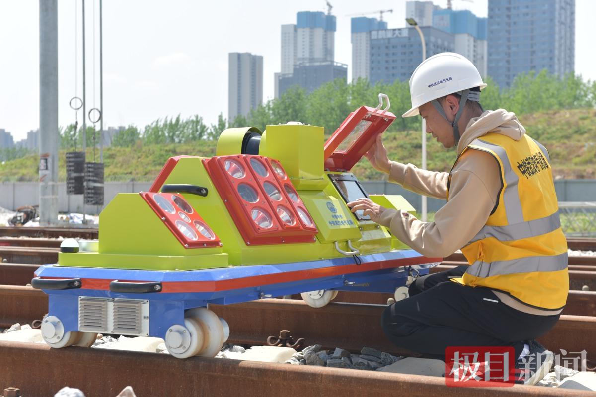 检测人员在黄黄高铁上使用接触网智能检测小车进行数据检测