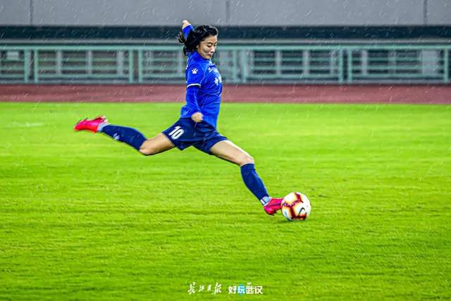 2020年10月30日,武汉体育中心,武汉·中国车谷江大女足夺冠庆典上,江大女足在大雨中进行表演赛,他也在雨中抓拍到了铿锵玫瑰的坚韧意志。