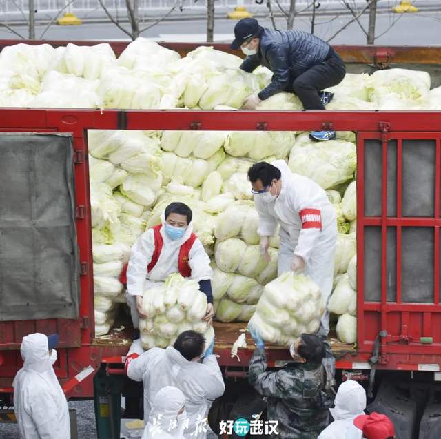 2020年3月12日,武昌区中南路街下徐家湾社区工作人员和下沉党员干部,冒雨搬运分发来自湖北石首的爱心菜。