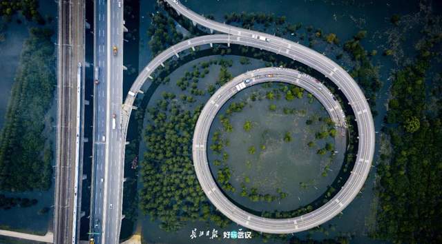 2020年7月,长江武汉段水位上涨,位于江心的天兴洲主动行洪,引江水进洲,立交桥匝道呈现出圆形弧线。
