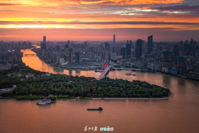 2020年的夏天,富有层次的晚霞映红了江水,照亮了晴川桥。