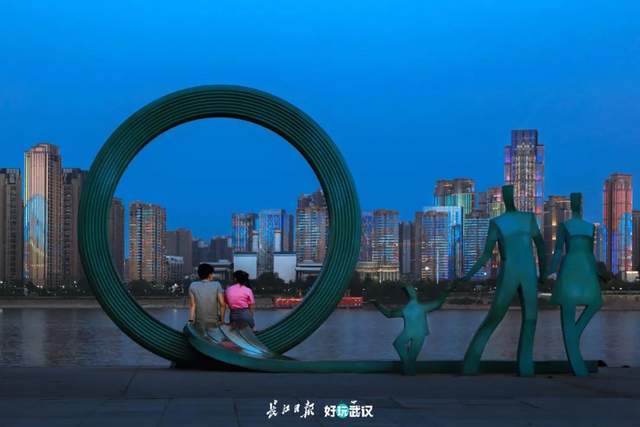 2020年5月3日,汉口江滩,一对年轻人坐在“一家人“雕塑上,望着对岸鳞次栉比的高楼和璀璨瑰丽的灯火,憧憬着未来。