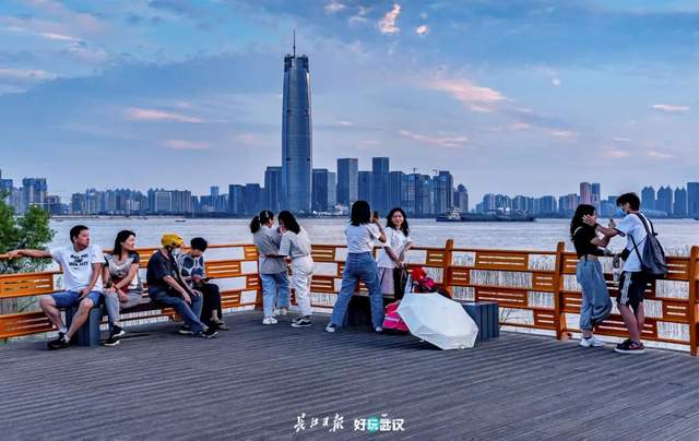2020年9月12日,汉口江滩栈桥。夕阳下,游人们陶醉在自己的风景中,这浪漫的一幕与背景的标志建筑物交织相映,安宁和谐又充满无限生机。