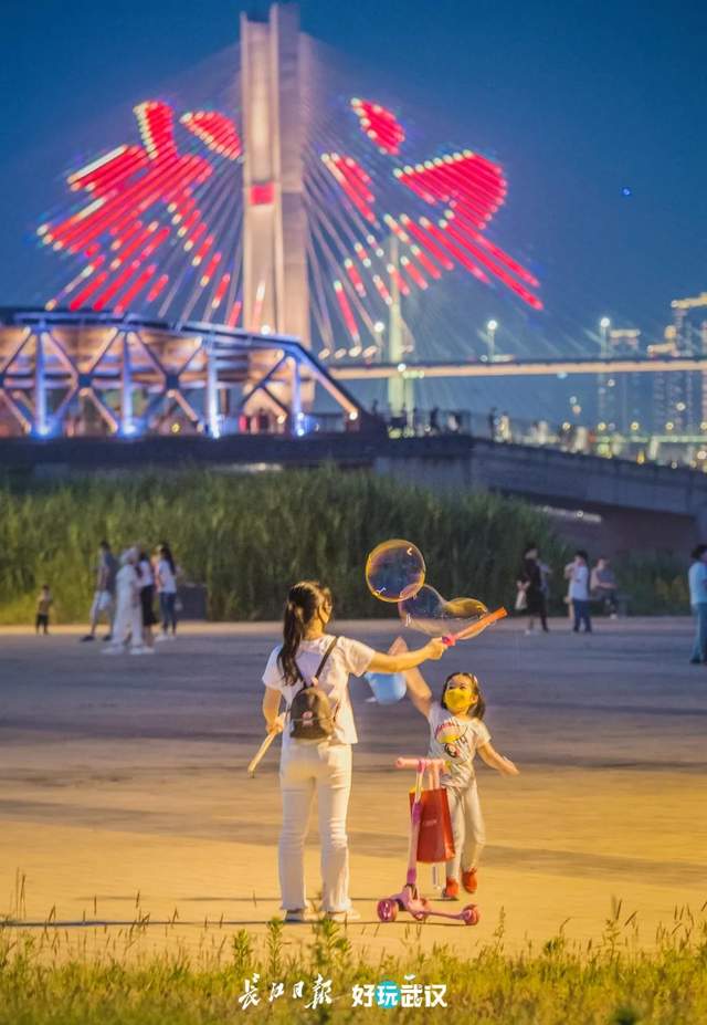 2020年5月1日晚,汉口江滩,玩泡泡水的母女俩,远处长江二桥上“武汉”两个大字熠熠生辉。