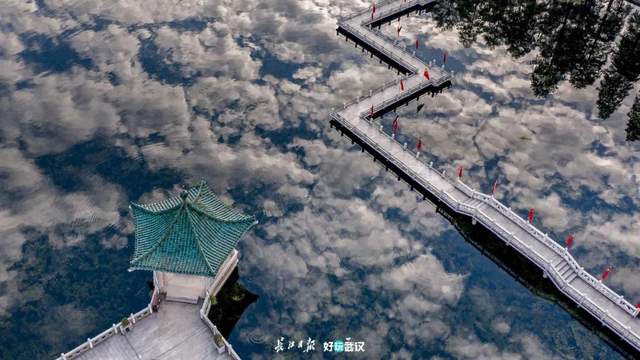 2020年国庆节,清晨的听涛景区,倒影在湖面上的朵朵白云,把湖水映衬得如仙境般美丽。俯瞰碧潭观鱼中的亭台楼阁,像云梯直达云端。