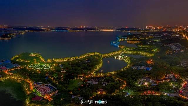 入夜的东湖听涛景区,湖边道路挂满了无数彩灯,倒映在水波荡漾的湖面上,湖岸线变成了七彩斑斓的宝石项链。