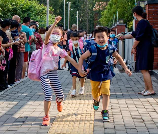 2020年9月1日,武汉市育才小学树人校区外,放学的孩子们开心地走出校门。绽放的笑容、胜利的手势和快乐地奔跑,是对快乐最好的诠释。