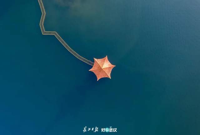 2020年8月1日,木兰湖水位上涨,连接亭子的小路被淹,但从空中俯瞰,湖水清澈,小路依稀可辨,让湖中间的亭子也不那么孤独。