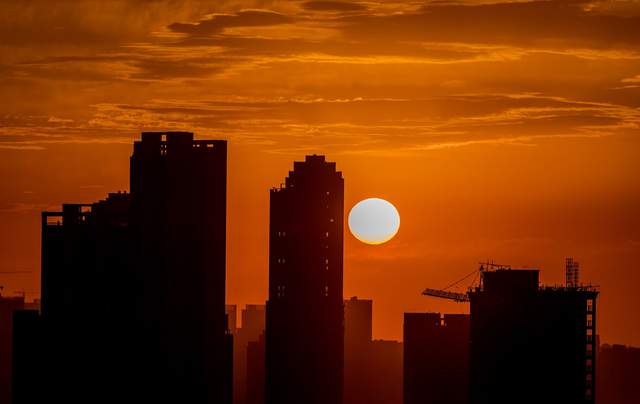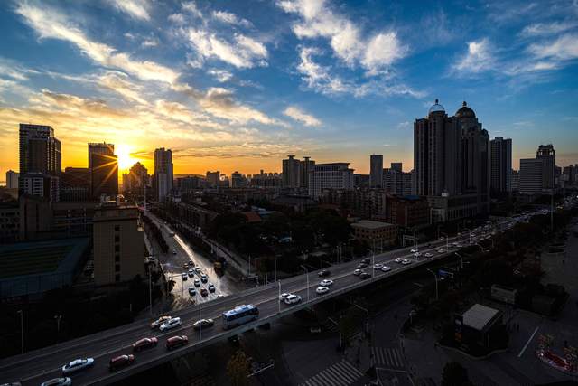 一轮红日挂在高楼间,安静的城市在朝阳下苏醒,早高峰的高架桥上,车队流动起来,人们迎来忙碌又充实的一天。