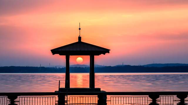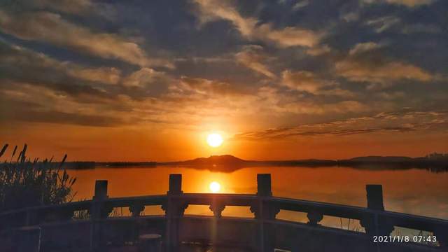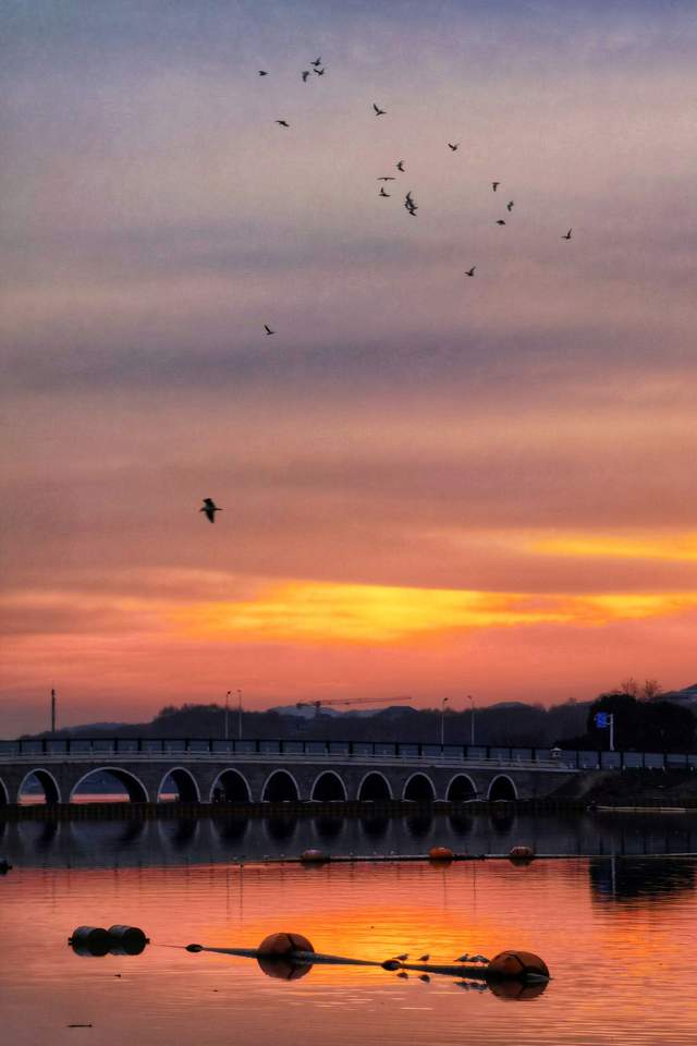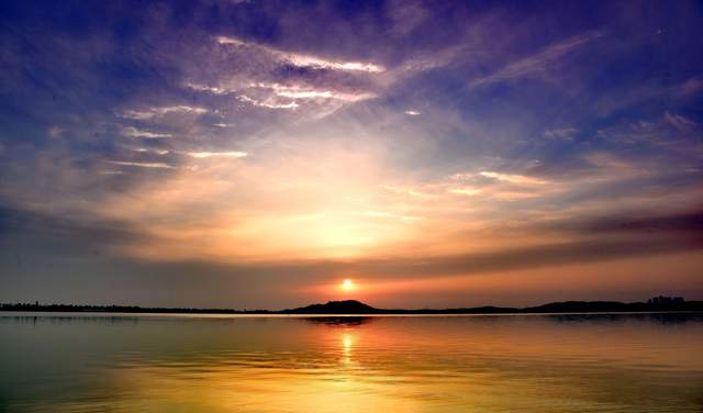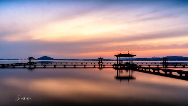 东湖的日出是真正的水天一色,天空壮阔,水面如镜,不少摄影师用堆栈的拍摄方法,拍出如绸缎般丝滑的天空和水面。