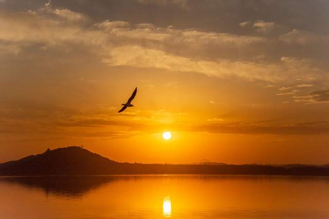 朝阳下,飞鸟掠过东湖水面。城市摄影队 放飞心情 摄