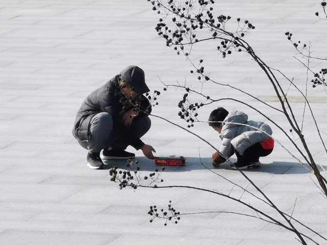 古田二路汉江湾江滩公园,父子俩蹲在地上玩汽车。城市摄影队 贇贇 摄