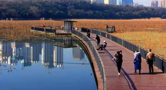 月湖公园,栈桥上享受阳光美景的人们。城市摄影队 张忠辉 摄