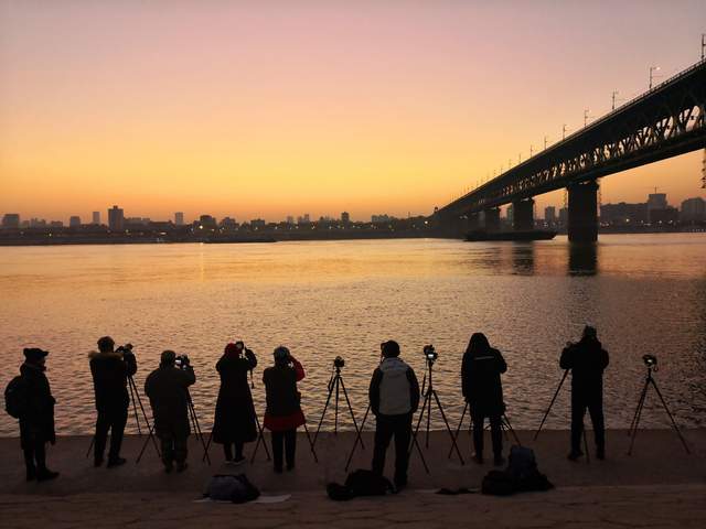 长江大桥下的汉阳江滩,是拍日出的黄金机位,在这里可以拍到日上黄鹤楼的经典画面。很多摄影师天不亮就早早起床,在江边支上三脚架等日出。摄影师们常能在这里遇到相熟的摄友,大家边等候边聊天,谈笑间寻得一份开心。太阳露头时,现场马上安静下来,只听到一阵咔嚓咔嚓声。