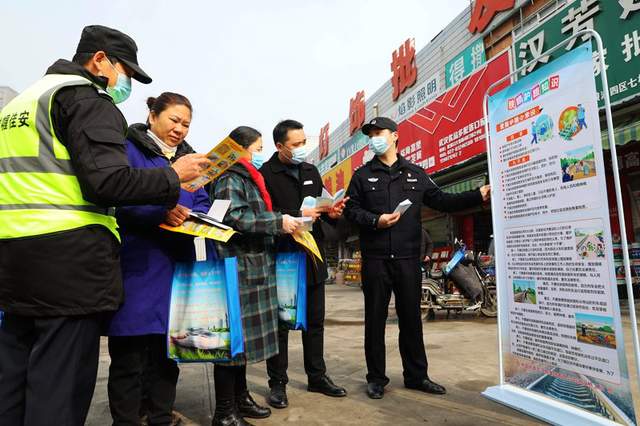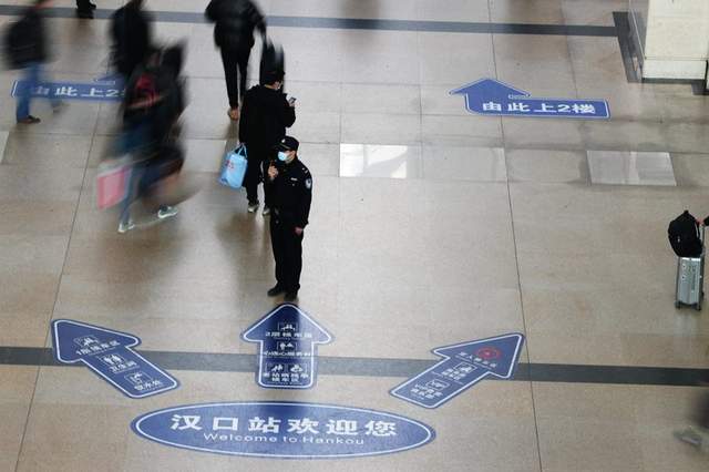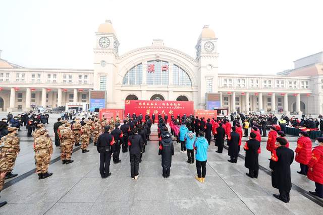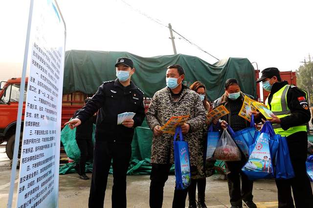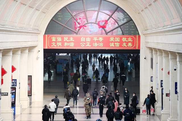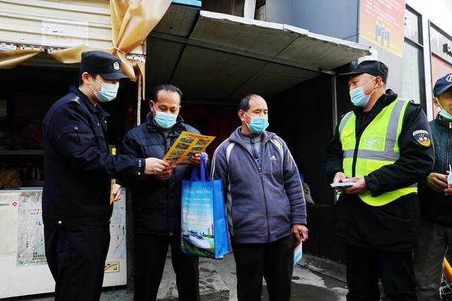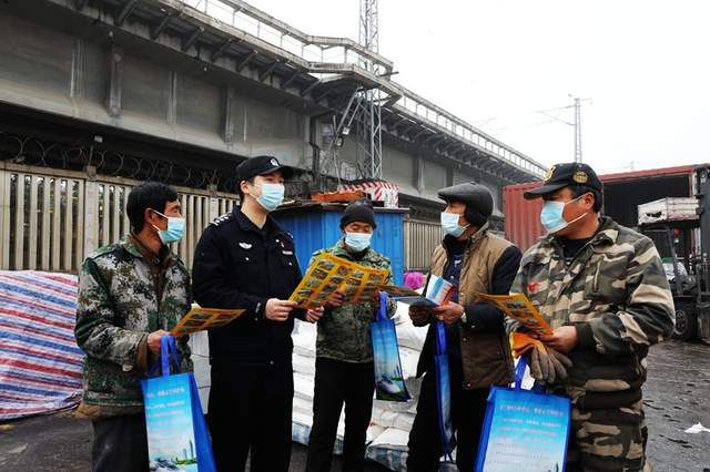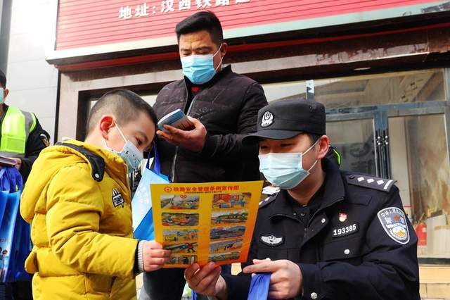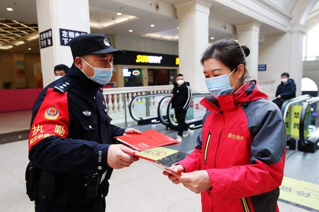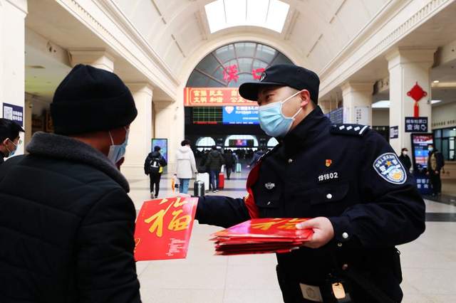 2021年1月28日,春运首日,湖北武汉。当日,武汉铁路公安处组织党团员民警会同中国铁路武汉局集团公司工作人员成立爱民实践小分队,在统筹做好疫情防控工作的同时,分别在汉口火车站、汉西铁路建材市场、舵落口市场等地开展春运志愿服务活动。站区内,铁路民警开展治安巡查、安全知识宣传,维护旅客乘车秩序,营造良好的铁路出行环境;在铁路沿线周边,铁路民警联合铁路单位积极开展路外安全宣传活动,为“就地过年”的群众送去平安祝福。 (图胡金力 文喻泽成)
