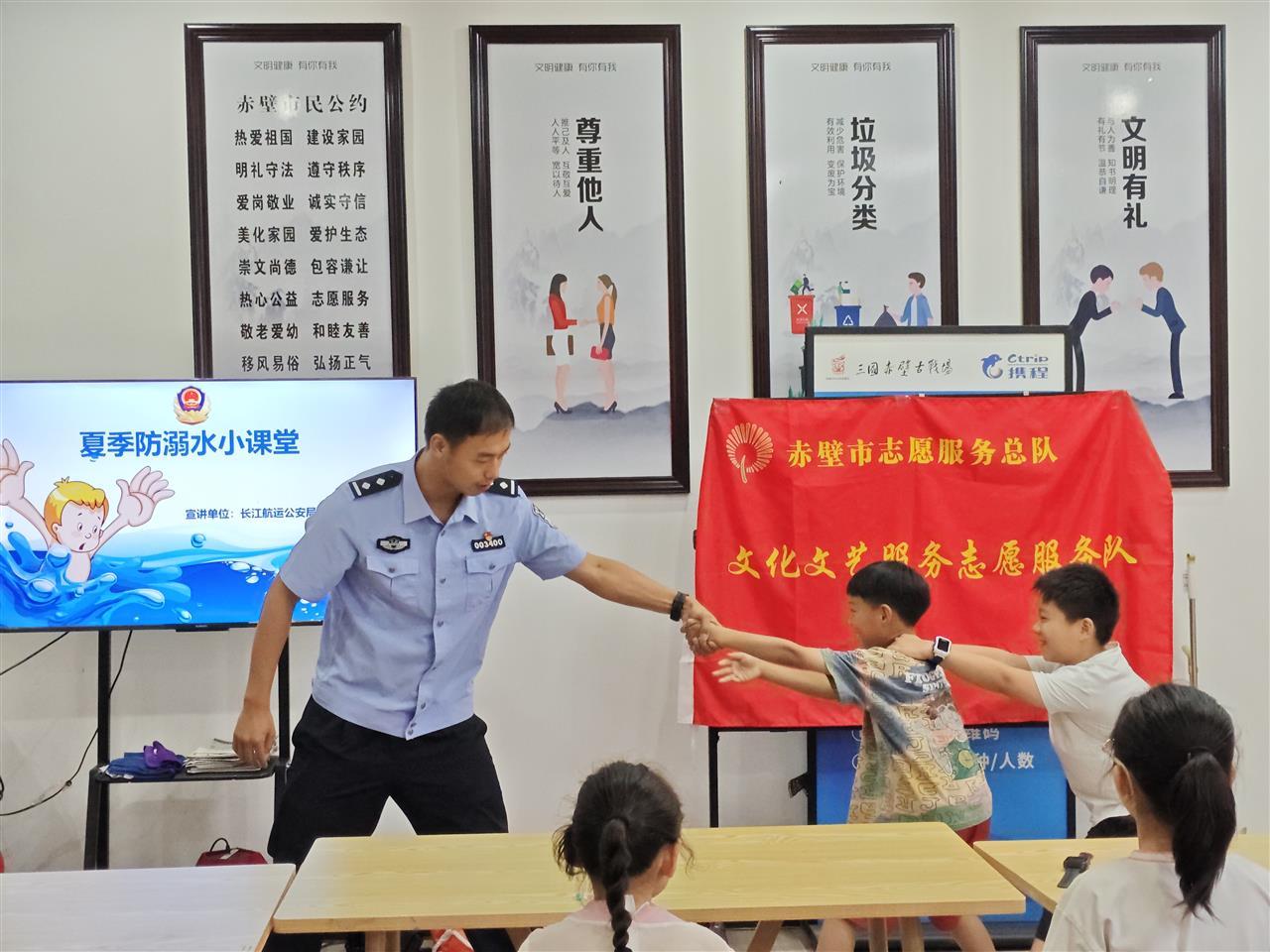 “原来救落水的人这么危险,以后遇到这种情况我一定先告诉大人!”7月23日,在赤壁市赤壁镇综合文化站,一场别开生面的安全教育活动正在热闹进行,参与模拟救援体验的小朋友发出了这样的感慨。当天,长航武汉公安嘉鱼派出所民警走进社区,为20余名留守儿童送上了一堂集防拐骗、长江保护、防溺水于一体的“安全大课堂”,用生动互动的形式筑牢孩子们的安全防线。