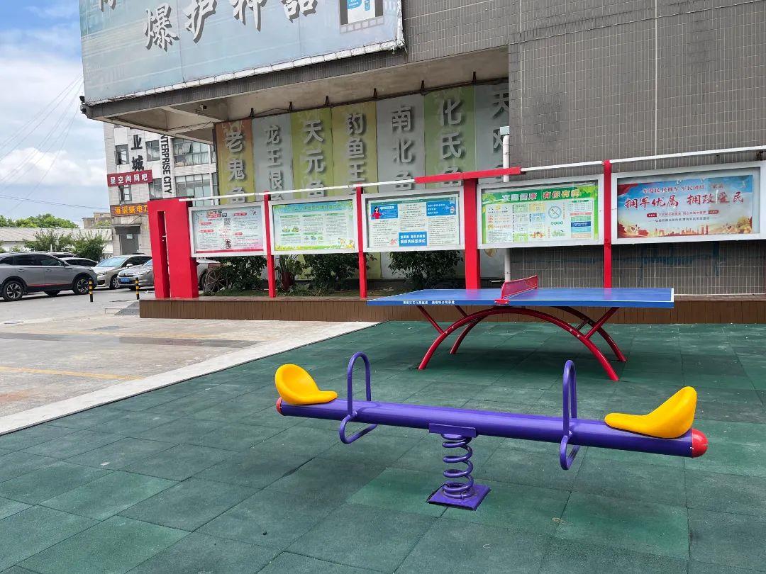 在安装游乐设施的同时,宣传栏的移位和改造工作也同步进行。原宣传栏移装完毕后,在其下端增设了一排木制座椅,并对其表面进行了打磨、防腐处理,不仅保留了居民获取政策信息的功能,也方便家长在照看儿童时有一个歇脚之处。经过半个多月的紧张施工,游乐场于7月底正式建成。