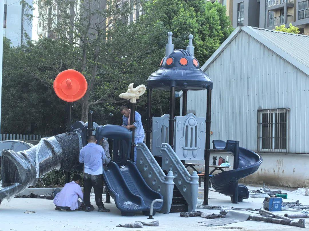 接下来是秋千、滑滑梯、跷跷板等娱乐设施的安装。施工人员按照设计方案标注的位置,逐一进行安装。滑滑梯体积较大,需要几个人配合着抬到预定位置,然后用膨胀螺丝将底部牢牢固定在地面上,防止使用时晃动。跷跷板的安装相对简单些,固定好支架后,再把两端的座椅安装牢固,施工人员还特意检查了连接处的螺丝是否拧紧,确保安全……在安装过程中,不时有小朋友隔着安全距离远远眺望,兴奋地与自己的玩伴分享,一起期待游乐场的早日落成。