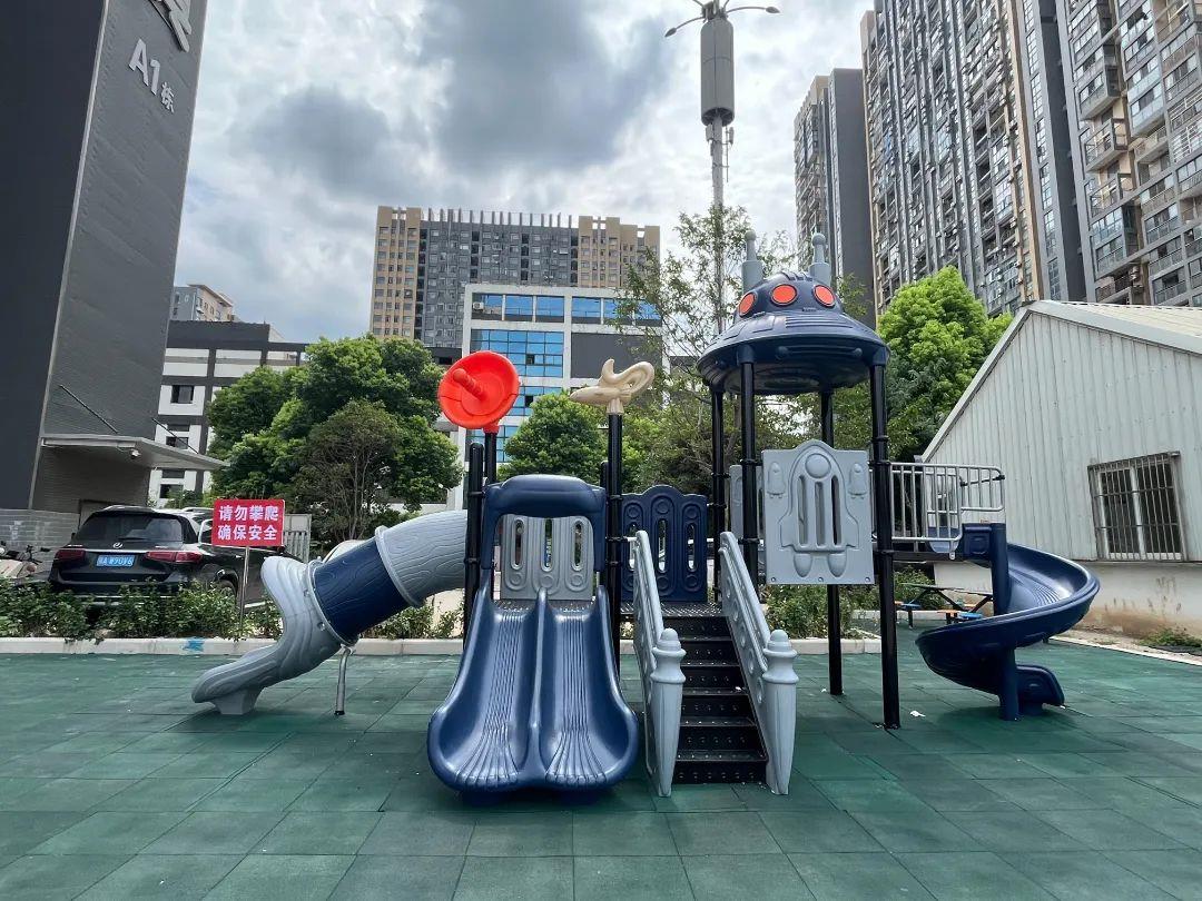游乐场建成后,很快成了小区里最热闹的地方。每天放学后和周末,这里都挤满了孩子,欢声笑语不断。蓝色的大型滑滑梯格外显眼,两个秋千在微风中轻轻晃动,跷跷板的两端还画上了卡通图案。地面铺设了绿色的塑胶垫,能有效缓冲孩子们玩耍时的磕碰。“这塑胶垫脚感软乎乎的,孩子摔一跤也不怕疼,我们家长看着也放心。” 正在座椅上看着孙女玩滑滑梯的赵奶奶说道。