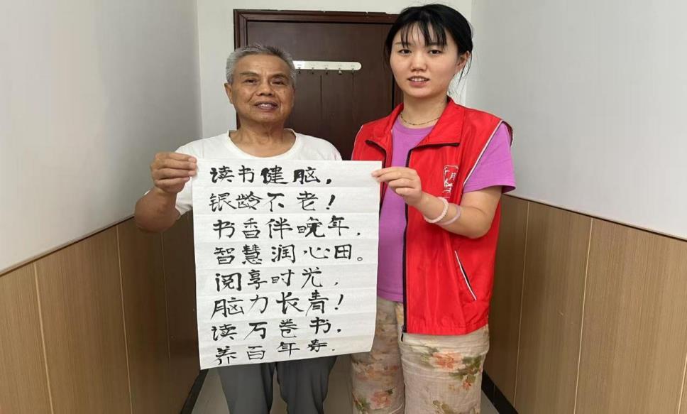 此外,在活动现场一位老年人还书写了与读书相关的书法作品,表达对阅读的热爱。随后,多位老年书法爱好者轮番登场,他们或书写经典诗词,或创作读书格言,一幅幅苍劲有力、富有韵味的书法作品在他们笔下诞生。他们还将传统书法艺术与移风易俗主题完美结合,展现出老年人与时俱进的精神风貌。