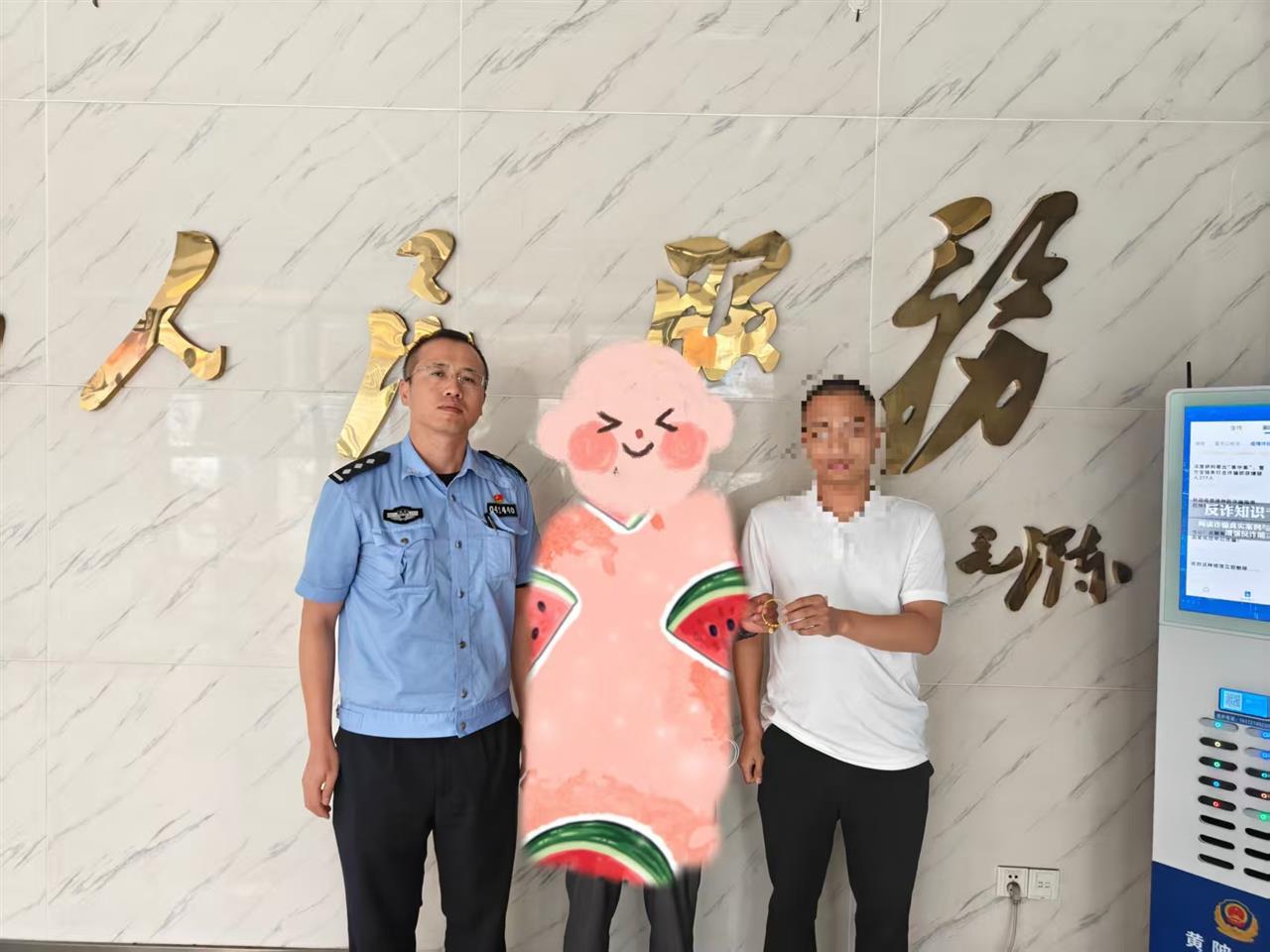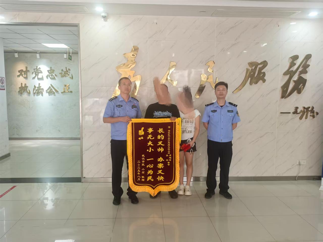 看到完璧归赵的金镯子,黄女士及家属激动万分。为表达感激之情,8月13日,黄女士与家属专程将印有“长的又帅办案又快、事无大小一心为民”字样的锦旗送至民警张军、辅警谌超峰手中,并对拾金不昧的外卖员周师傅表达了诚挚谢意。