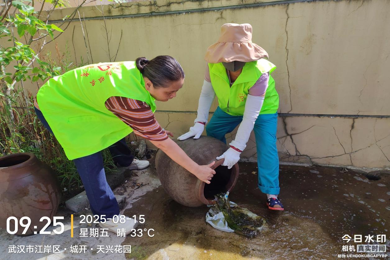 为有效防控登革热、基孔肯雅热,8月15日,武汉长江新区谌家矶街道天兴花园社区近期聚焦“源头灭蚊”,扎实推进清洁家园环境整治工作,加大以清理积水为主要的爱国卫生运动力度,为居民健康保驾护航。
