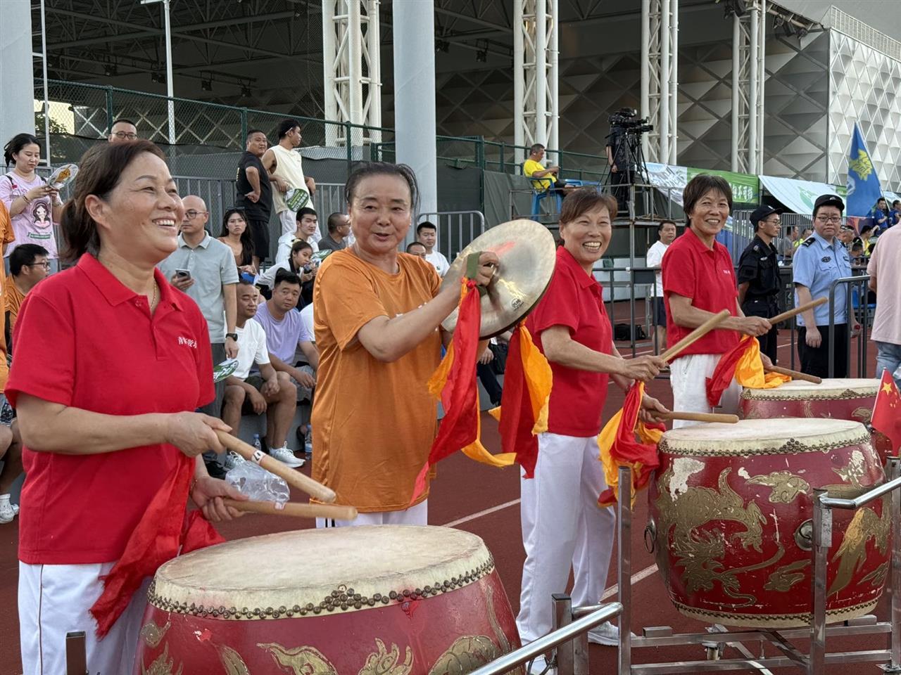 场上拼抢激烈,看台上同样热情似火。“东西湖加油!”的呐喊声伴随着激昂的鼓点划破长空。东西湖区居民肖丽君手持镲,带领五位队员奋力擂响大鼓,后排由居民组成的“人浪”齐声高呼,为家乡球队倾力助威。
