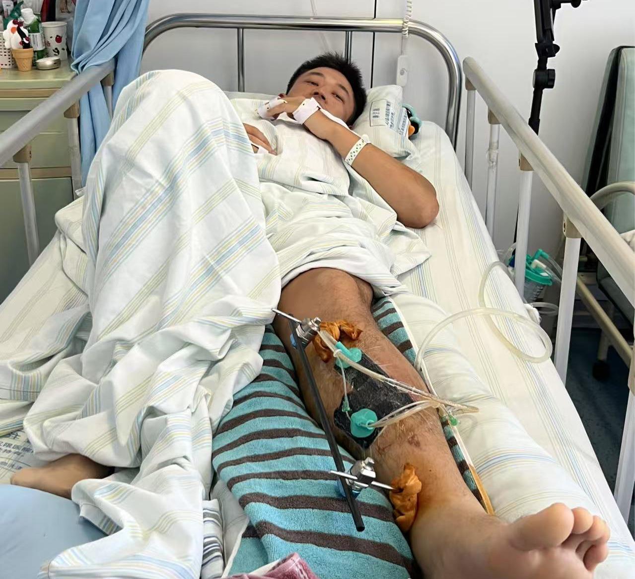 8月19日午后,中部战区总医院骨科病房里,武汉市公安局洪山区分局交通管理大队快骑中队辅警刘驰平躺在病床上,肿得比大腿还粗的左小腿被插入2根钢钉,外固定支架将完全折断的胫骨和腓骨暂时托住,双手无名指也裹着固定器具。面对采访,刘驰说话时声音还带着术后的虚弱,可眼神里藏着股不服输的劲儿:“两周后的正式手术得好好拼,我还想骑上快骑摩托,接着守。”