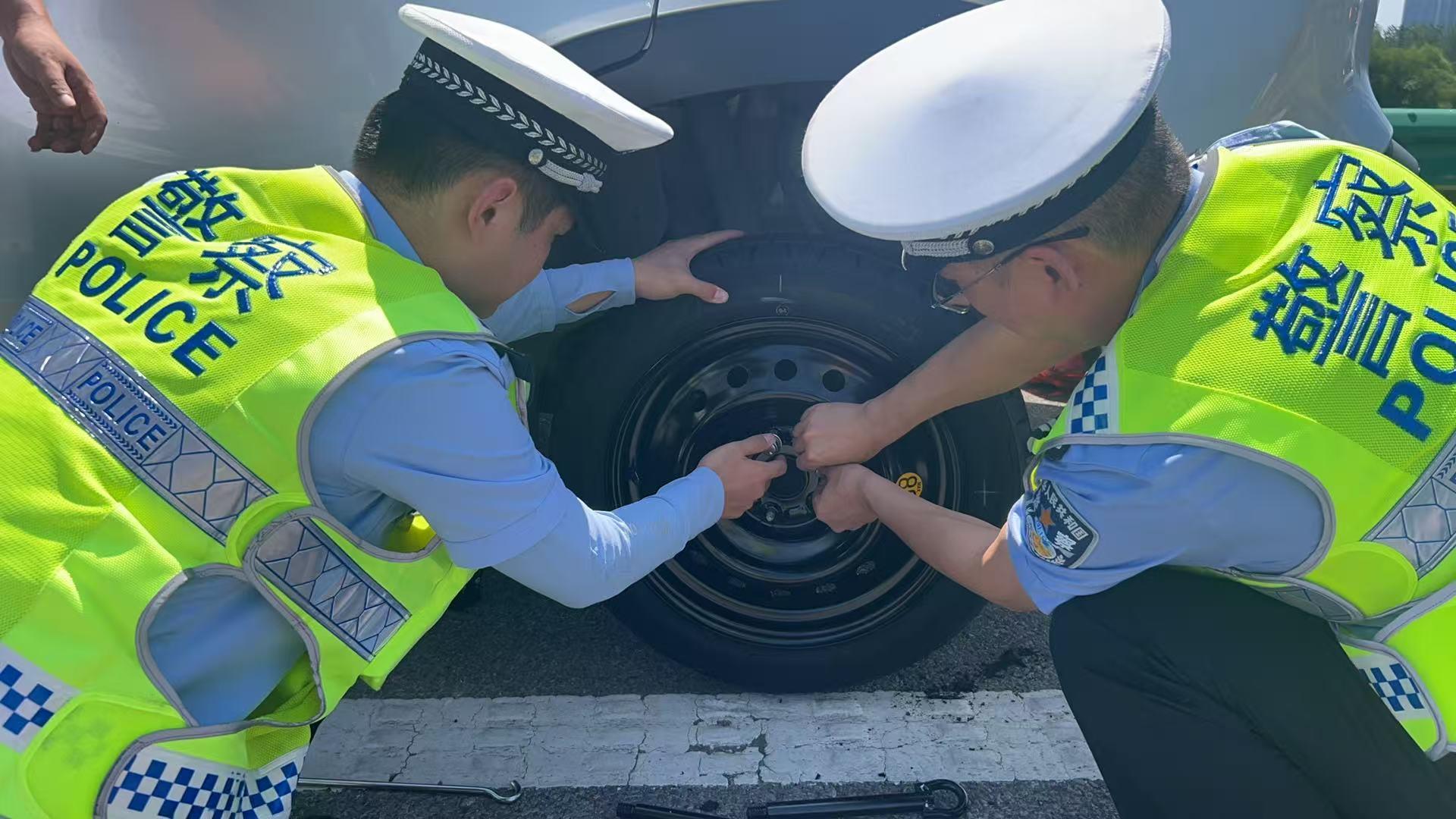 沥青路面的高温透过鞋底传来灼痛感,徐伟蹲在车旁,熟练取出千斤顶、备胎等工具开始操作。拆卸高温膨胀的螺栓时,他需用膝盖顶住扳手借力;安装备胎时,反复核对角度确保安全。20分钟的忙碌里,后背的汗水顺着脊梁流下,藏青色警服被完全浸透。“师傅,路上注意检查胎压,有问题及时联系我们。”换胎完成后,徐伟不忘叮嘱安全事项,便转身继续投入巡逻。