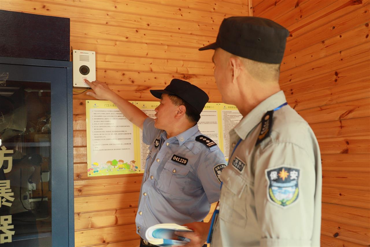 8月26日,黄陂区分局滠口街派出所社区民警贺广武深入龙巢幼儿园,细致检查校园安防工作。他从安保力量配置、防护装备性能,到防范制度落实和应急预案流程,逐一排查,全力拧紧校园“安全阀”。