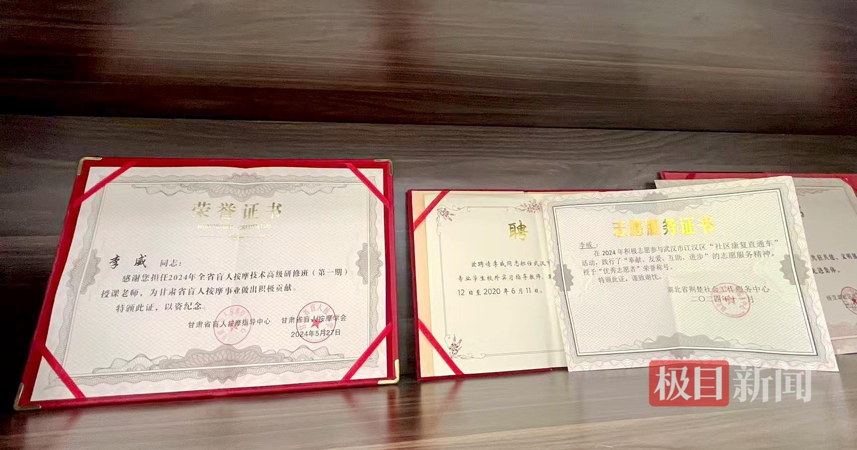 此外,为了不断提升自身技艺,李威师从武汉盲校医师胡国强老师,不断地学习、实践推拿按摩技术,取得国家高级按摩师证。