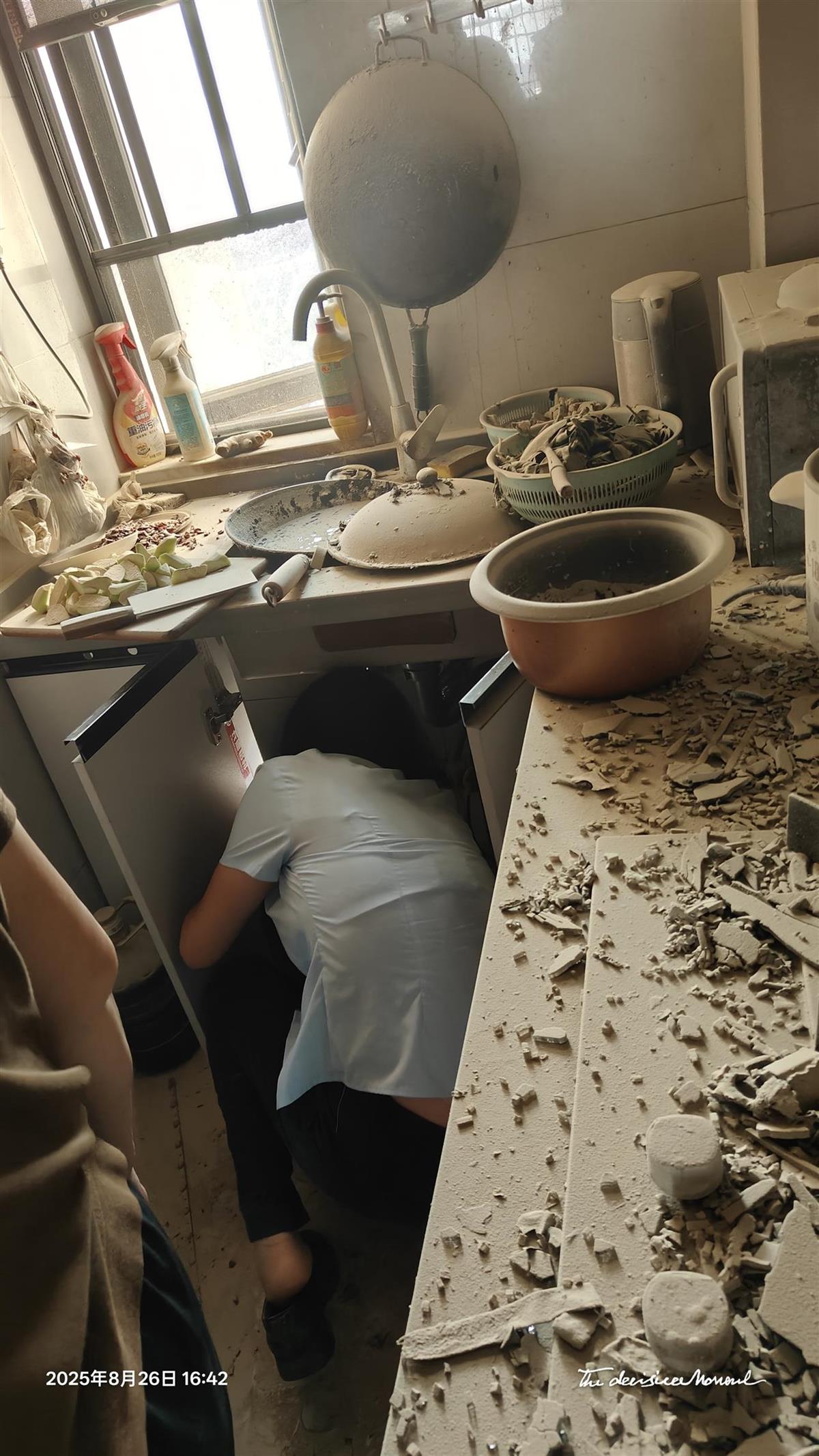 16时31分,当物业团队破门而入时,厨房内已是一片狼藉:明火已灭,白色墙壁被浓烟熏成炭黑色,抽油烟机钢化玻璃和瓷砖碎裂一地,吊顶正中间被崩出个大洞,高压锅安全阀处仍冒着丝丝白烟。