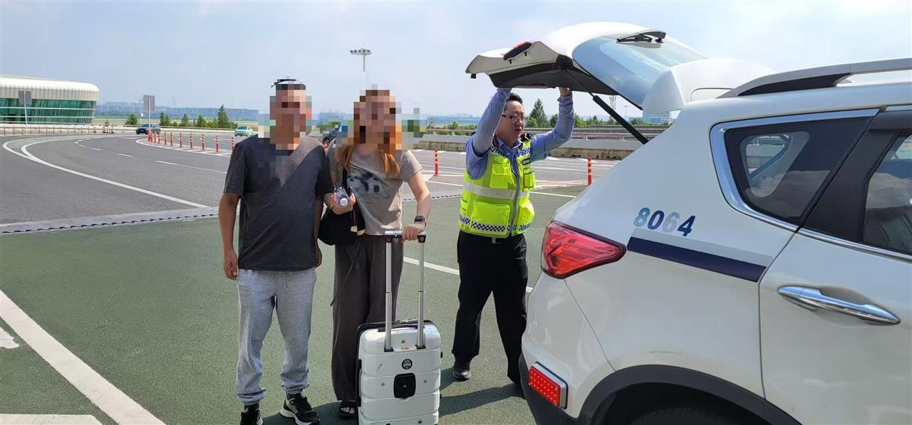 情况紧急,王劭彦当即决定:用警车送乘客赶飞机!王劭彦指引乘客将行李转移到警车上。朱博在现场摆放锥筒做好安全防护,同时对故障车辆进行了妥善安置。现场安排妥当后,民警驾车一路疾驰,15分钟后警车稳稳停在机场站台广场。父女俩下车后连声道谢:“麻烦你们了,辛苦警官了。”王邵彦笑着摆了摆手:“这是我们该做的!快进去吧,时间还来得及,别耽误了登机。”看着父女俩匆匆进机场的身影,两人转身驾车返回了巡逻岗位。