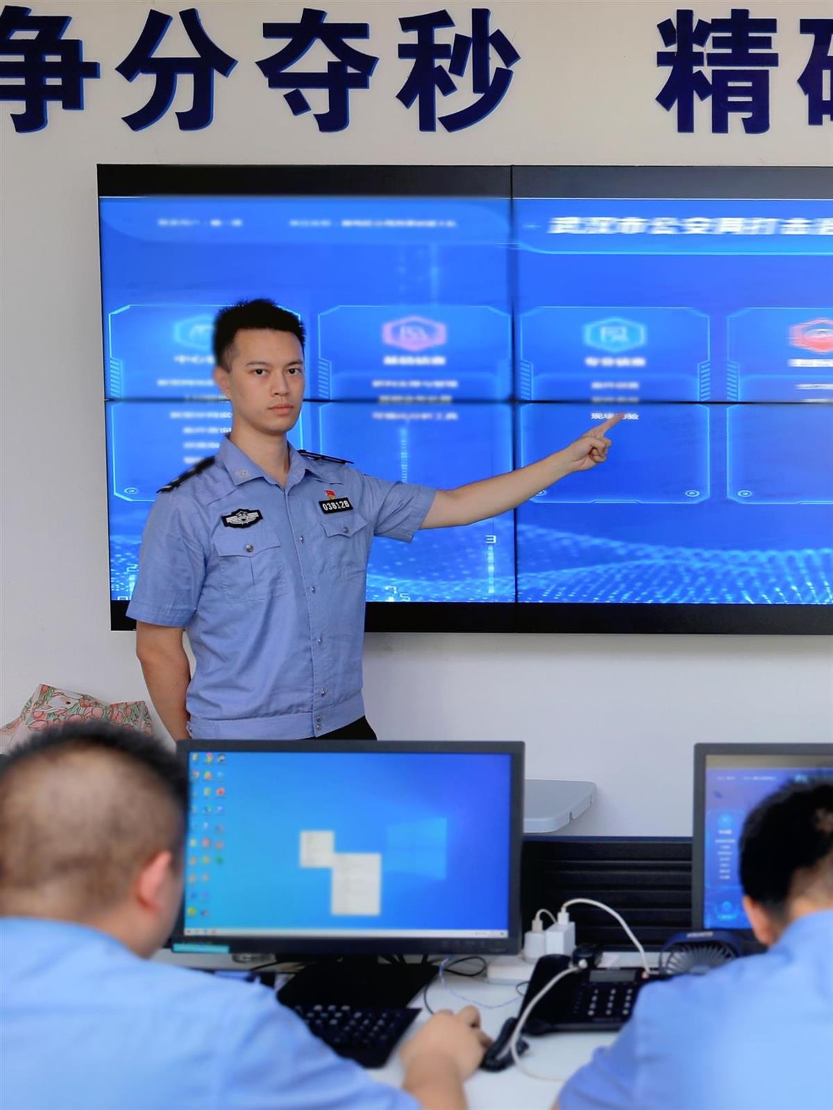 8月25日下午,武汉市公安局蔡甸区分局刑事侦查大队反诈中心内略显安静。研判室设在大厅,多位民警正紧盯屏幕,只有键盘的敲击声时而响起。研判室里,1米85个头的28岁民警张威眼神明亮坚定,看着一组数据做着缜密的研判。